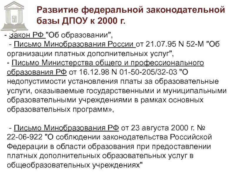 Развитие федеральной законодательной базы ДПОУ к 2000 г.