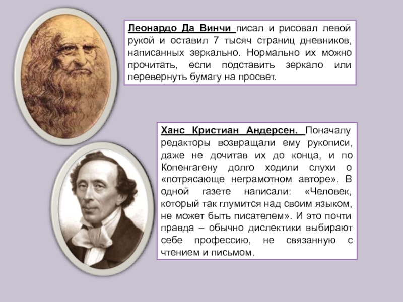 Ханс Кристиан Андерсен. Поначалу редакторы возвращали ему рукописи, даже не дочитав их до конца, и по Копенгагену долго ходили слухи о «потрясающе неграмотном авторе». В одной газете написали: «Человек, который так глумится над своим языком, не может быть писателем». И это почти правда – обычно дислектики выбирают себе профессию, не связанную с чтением и письмом.