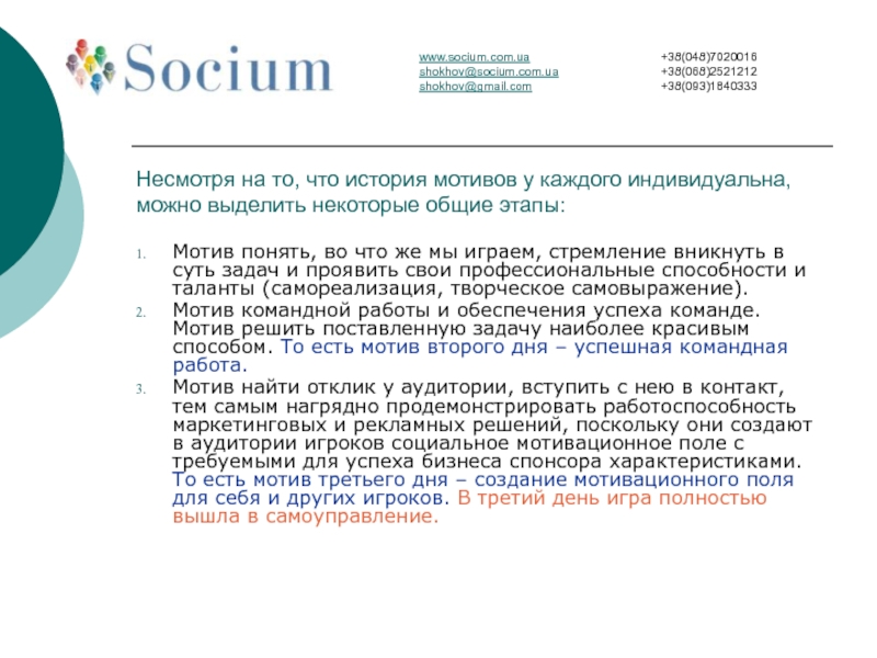 Мотив найти отклик у аудитории, вступить с нею в контакт, тем самым нагрядно продемонстрировать работоспособность маркетинговых и рекламных решений, поскольку они создают в аудитории игроков социальное мотивационное поле с требуемыми для успеха бизнеса спонсора характеристиками. То есть мотив третьего дня – создание мотивационного поля для себя и других игроков. В третий день игра полностью вышла в самоуправление.