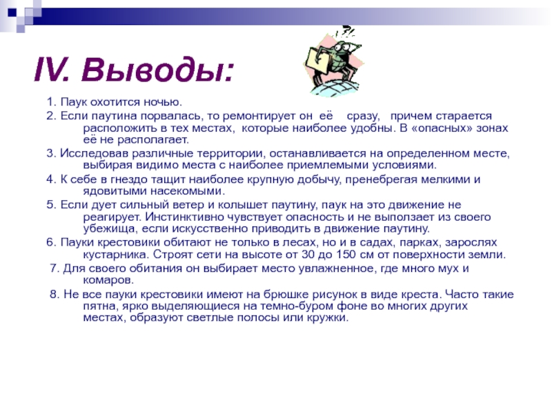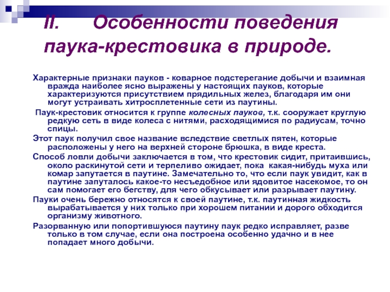 Слайд 4II. Особенности поведения паука-крестовика в природе.