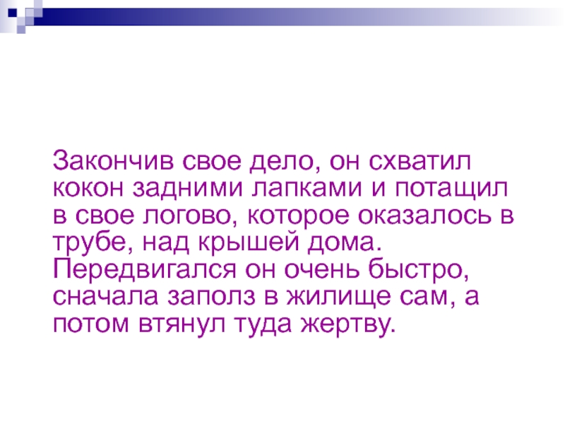 Слайд 8Закончив свое дело, он схватил кокон задними лапками и потащил в