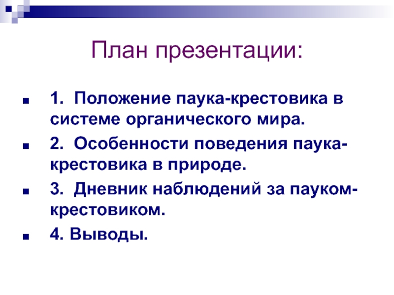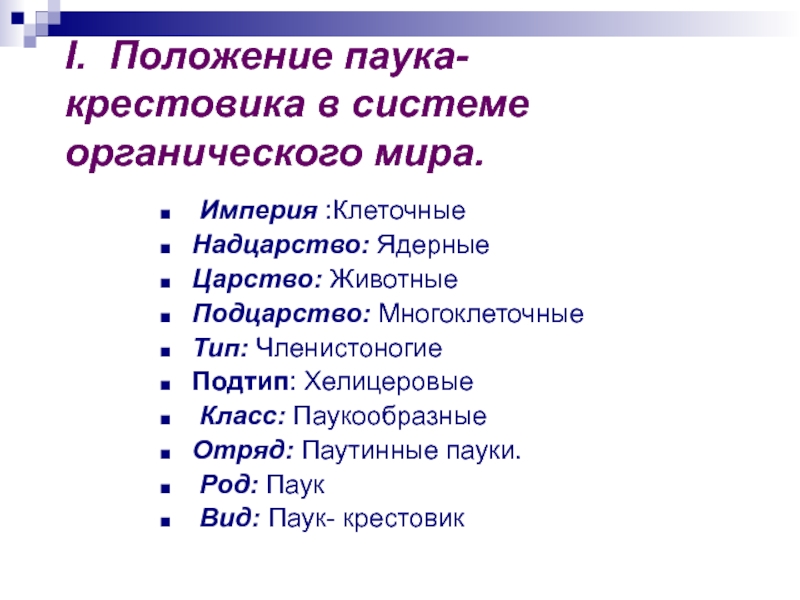 Слайд 3I. Положение паука- крестовика в системе органического мира.