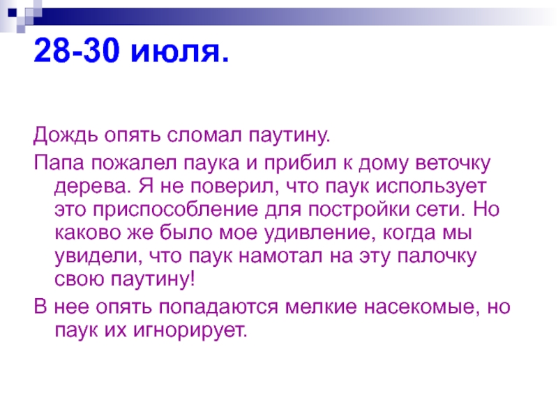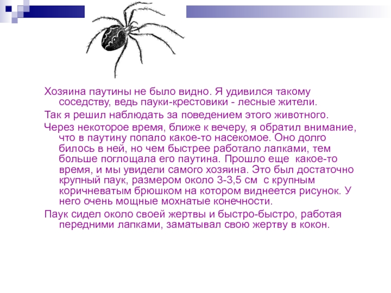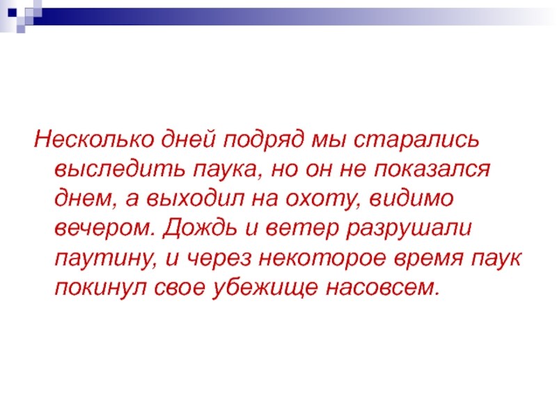 Слайд 18Несколько дней подряд мы старались выследить паука, но он не показался