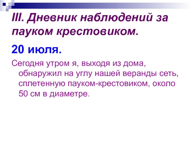 Слайд 5III. Дневник наблюдений за пауком крестовиком.