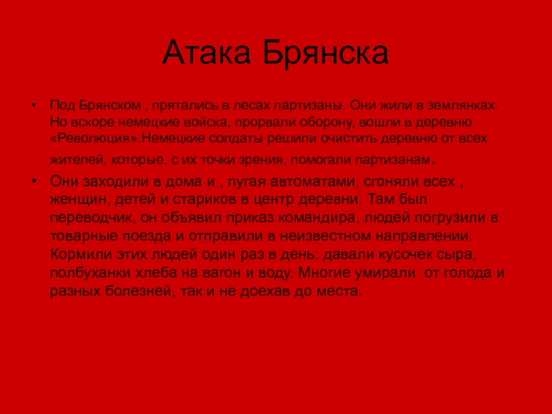 землянках. Но вскоре немецкие войска, прорвали оборону, вошли в деревню «Революция».Немецкие солдаты решили очистить деревню от всех жителей, которые, с их точки зрения, помогали партизанам.