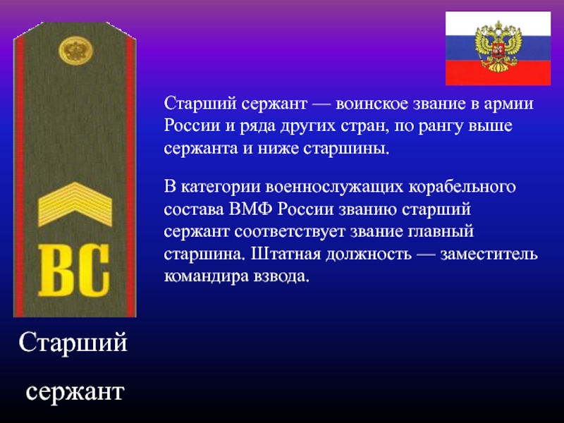 В категории военнослужащих корабельного состава ВМФ России званию старший сержант соответствует звание главный старшина. Штатная должность — заместитель командира взвода.
