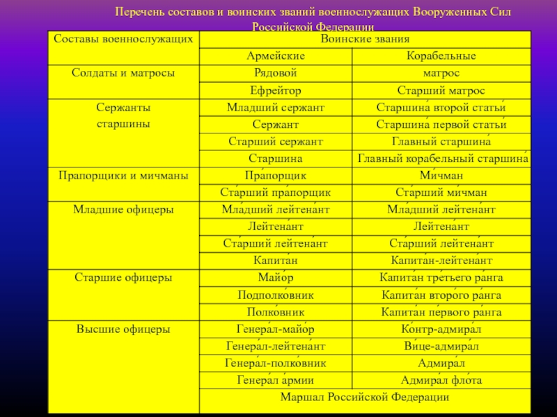 Воинское звание — определяет служебно-правовое положение или статус (права, обязанности) военных по отношению к другим военным.