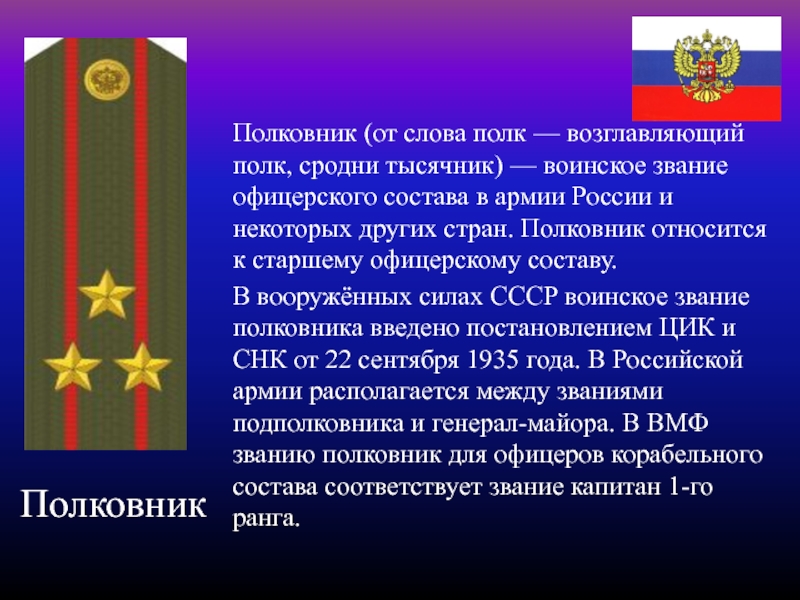 В вооружённых силах СССР воинское звание полковника введено постановлением ЦИК и СНК от 22 сентября 1935 года. В Российской армии располагается между званиями подполковника и генерал-майора. В ВМФ званию полковник для офицеров корабельного состава соответствует звание капитан 1-го ранга.