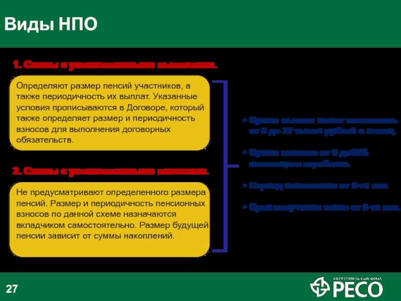 Не предусматривают определенного размера пенсий. Размер и периодичность пенсионных взносов по данной схеме назначаются вкладчиком самостоятельно. Размер будущей пенсии зависит от суммы накоплений.