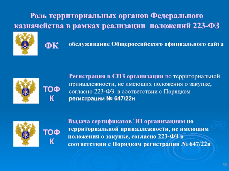 Слайд 50Роль территориальных органов Федерального казначейства в рамках реализации положений 223-ФЗ