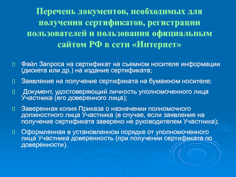 Слайд 53Перечень документов, необходимых для получения сертификатов, регистрации пользователей и пользования официальным