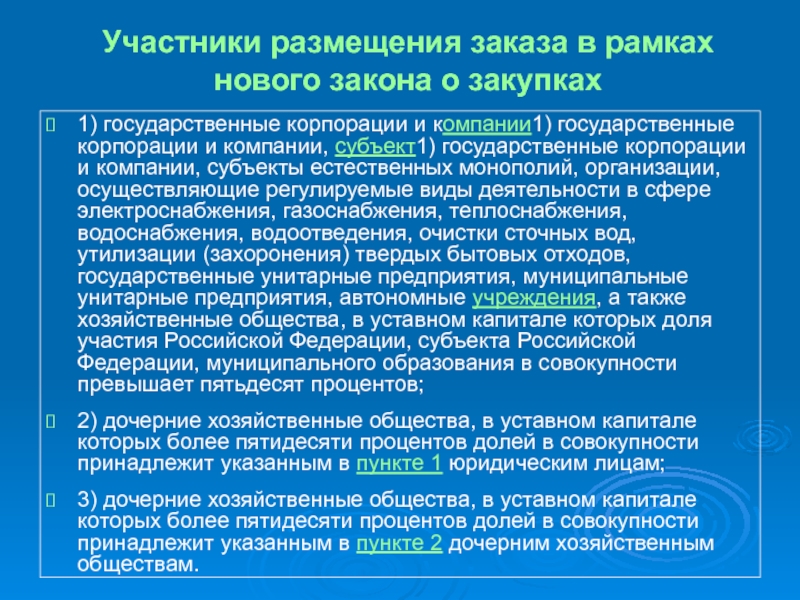 и компании1) государственные корпорации и компании, субъект1) государственные корпорации и компании, субъекты естественных монополий, организации, осуществляющие регулируемые виды деятельности в сфере электроснабжения, газоснабжения, теплоснабжения, водоснабжения, водоотведения, очистки сточных вод, утилизации (захоронения) твердых бытовых отходов, государственные унитарные предприятия, муниципальные унитарные предприятия, автономные учреждения, а также хозяйственные общества, в уставном капитале которых доля участия Российской Федерации, субъекта Российской Федерации, муниципального образования в совокупности превышает пятьдесят процентов;
