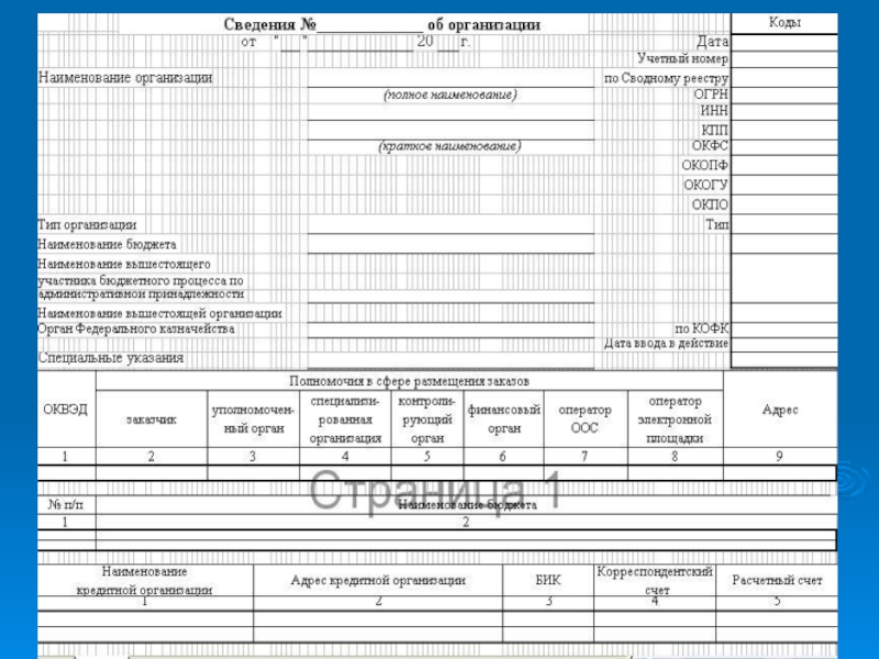 форма заполнения регистрационных данных организации, состоящая из нескольких блоков