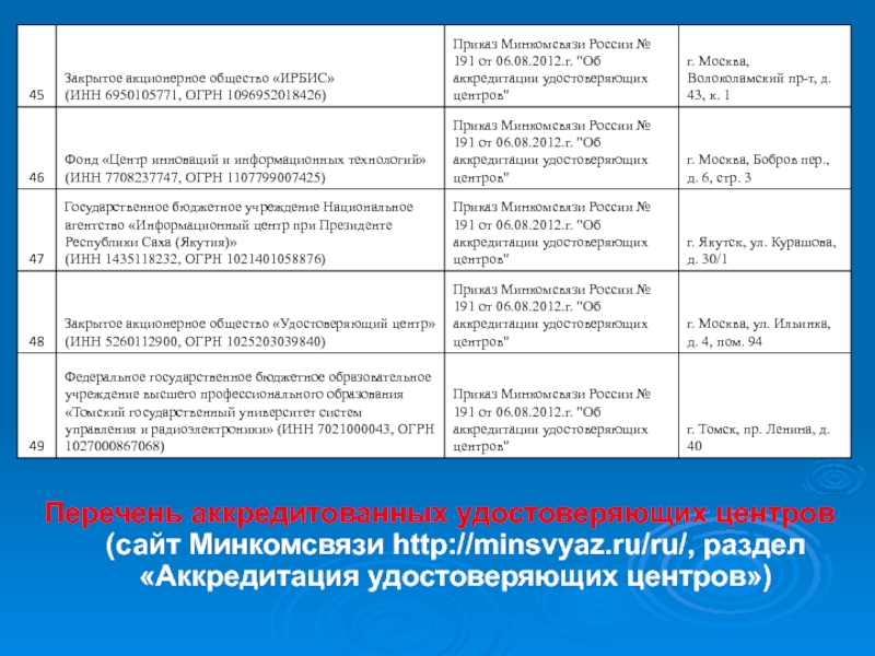 (сайт Минкомсвязи http://minsvyaz.ru/ru/, раздел «Аккредитация удостоверяющих центров»)