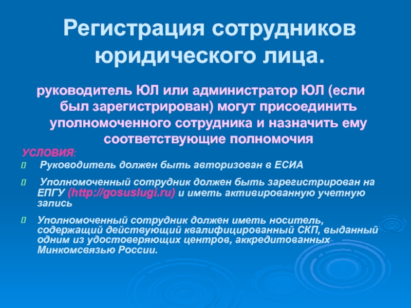 Уполномоченный сотрудник должен быть зарегистрирован на ЕПГУ (http://gosuslugi.ru) и иметь активированную учетную запись