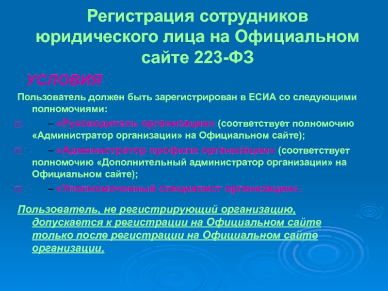 Слайд 46Регистрация сотрудников юридического лица на Официальном сайте 223-ФЗ