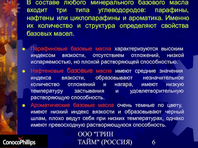 В составе любого минерального базового масла входит три типа углеводородов: парафины, нафтены или циклопарафины и ароматика. Именно их количество и структура определяют свойства базовых масел.