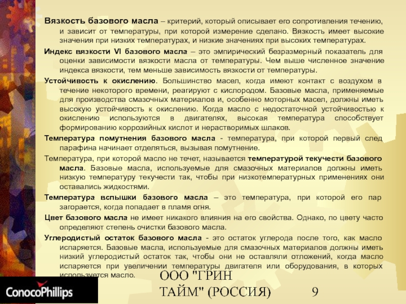 2) Хорошая текучесть в широких температурных интервалах. Характеристики текучести прежде всего зависят от вида базовых масел, но могут улучшаться применением присадок – депрессора и модификатора вязкости. Первый улучшает текучесть при низких температурах эксплуатации масла, второй при высоких.