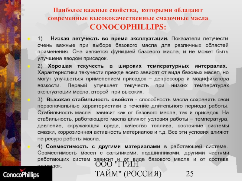 1) Низкая летучесть во время эксплуатации. Показатели летучести очень важные при выборе базового масла для различных областей применения. Она является функцией базового масла, и не может быть улучшена вводом присадок.