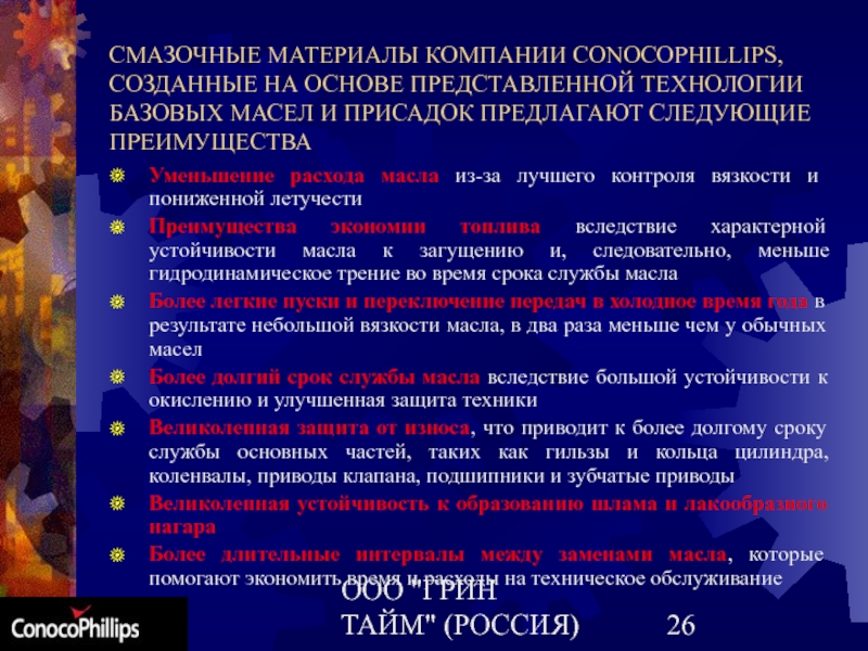 Великолепная защита от износа, что приводит к более долгому сроку службы основных частей, таких как гильзы и кольца цилиндра, коленвалы, приводы клапана, подшипники и зубчатые приводы