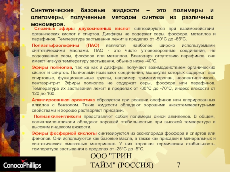 Синтетические базовые жидкости – это полимеры и олигомеры, полученные методом синтеза из различных мономеров.