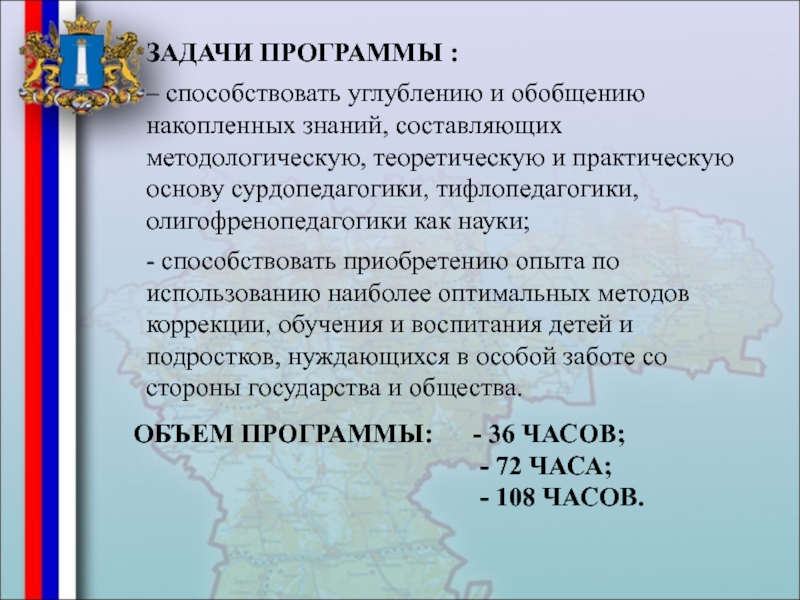 Задачи программы – способствовать углублению и обобщению накопленных знаний, составляющих методологическую, теоретическую и практическую основу логопедии как науки; овладение умениями и навыками диагностики, коррекции и профилактики отклонений в развитии, использование современных технологий обучения и воспитания.