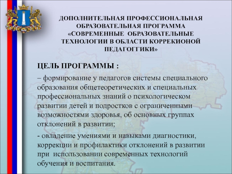 – формирование у педагогов системы специального образования общетеоретических и специальных профессиональных знаний о психологическом развитии детей и подростков с ограниченными возможностями здоровья, об основных группах отклонений в развитии;