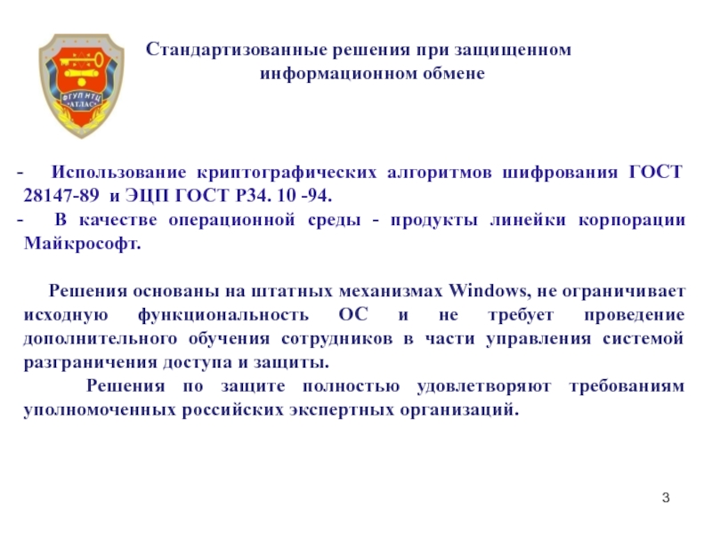 - Программные средства зашиты от НСД с криптографической защитой передаваемой по сети информации и шифрованием файлов на внешних и внутренних носителях;