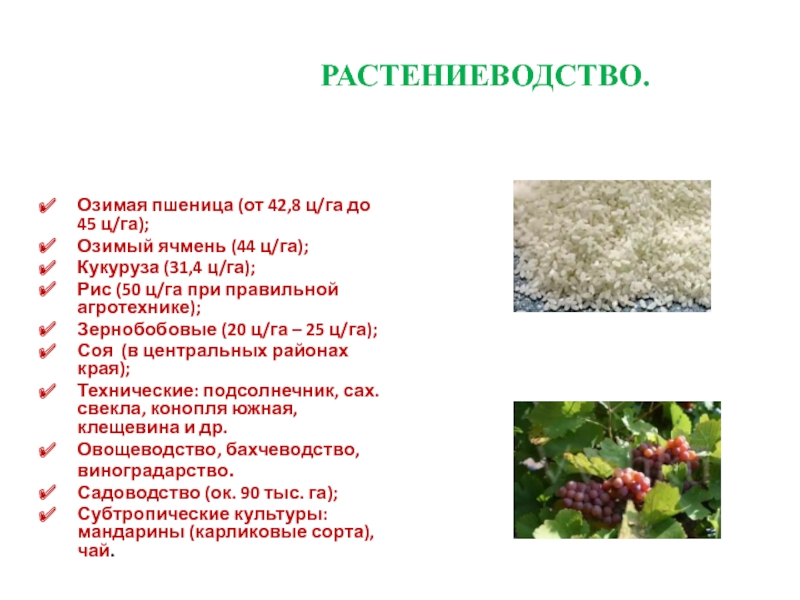 Субтропические культуры: мандарины (карликовые сорта), чай.