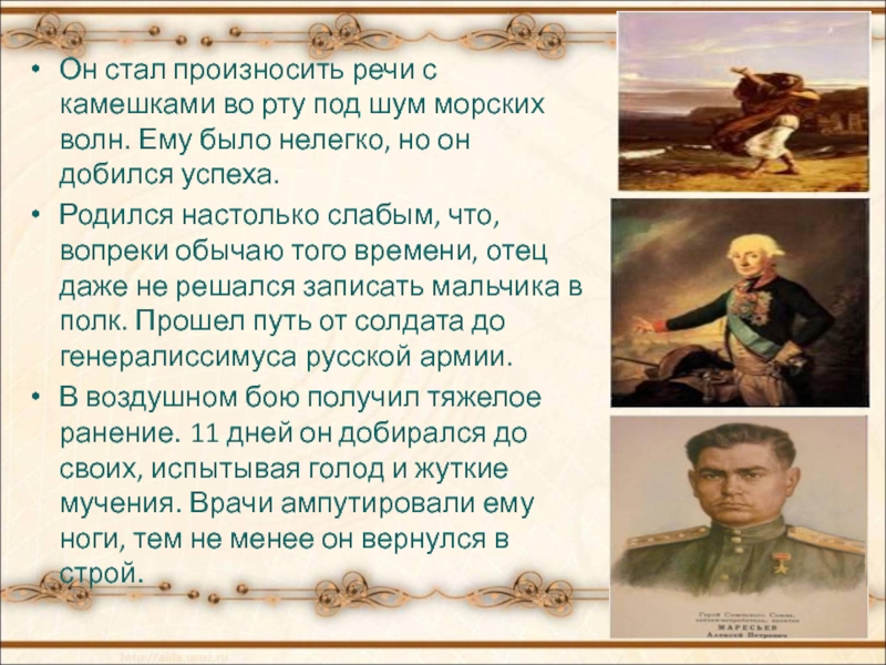 Родился настолько слабым, что, вопреки обычаю того времени, отец даже не решался записать мальчика в полк. Прошел путь от солдата до генералиссимуса русской армии.