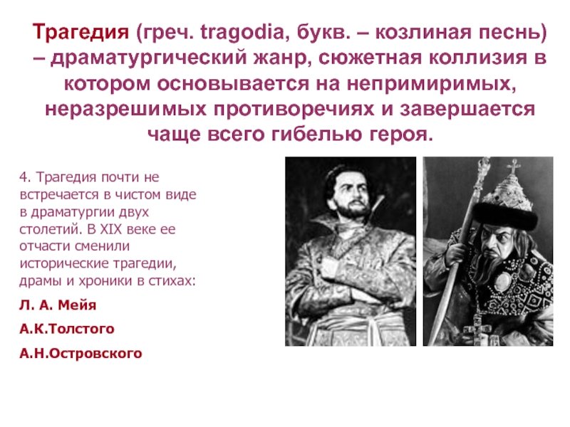 4. Трагедия почти не встречается в чистом виде в драматургии двух столетий. В ХIХ веке ее отчасти сменили исторические трагедии, драмы и хроники в стихах: