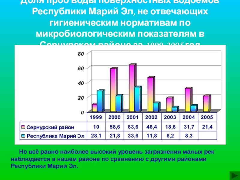 Но всё равно наиболее высокий уровень загрязнения малых рек наблюдается в нашем районе по сравнению с другими районами Республики Марий Эл.