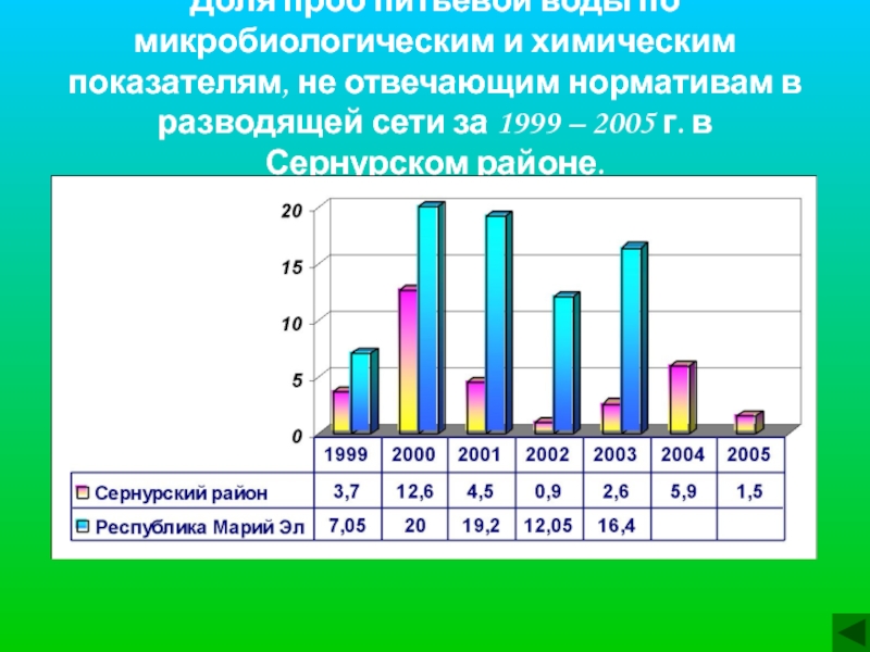 Вывод : Показатели химического анализа воды в Сернурской средней школе №1, в Сернурской средней школе №2, в детском саду №6 соответствуют нормам СанПина, показатели в колодце на улице Володарского не соответствует нормам СанПина.