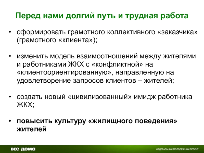 изменить модель взаимоотношений между жителями и работниками ЖКХ с «конфликтной» на «клиентоориентированную», направленную на удовлетворение запросов клиентов – жителей;