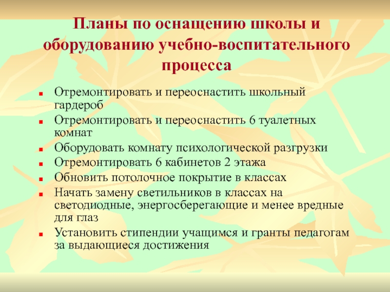 Слайд 39Планы по оснащению школы и оборудованию учебно-воспитательного процесса