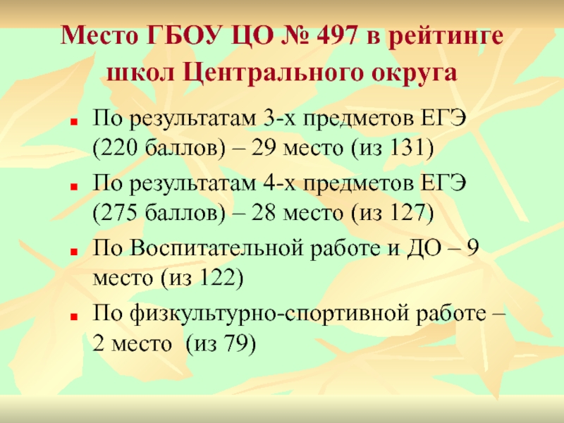 Слайд 36Место ГБОУ ЦО № 497 в рейтинге школ Центрального округа
