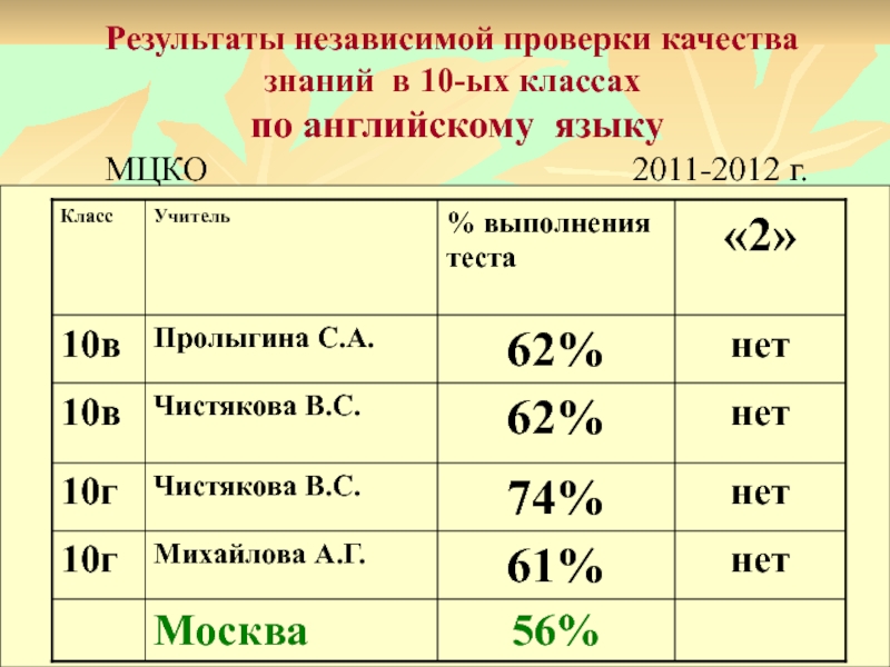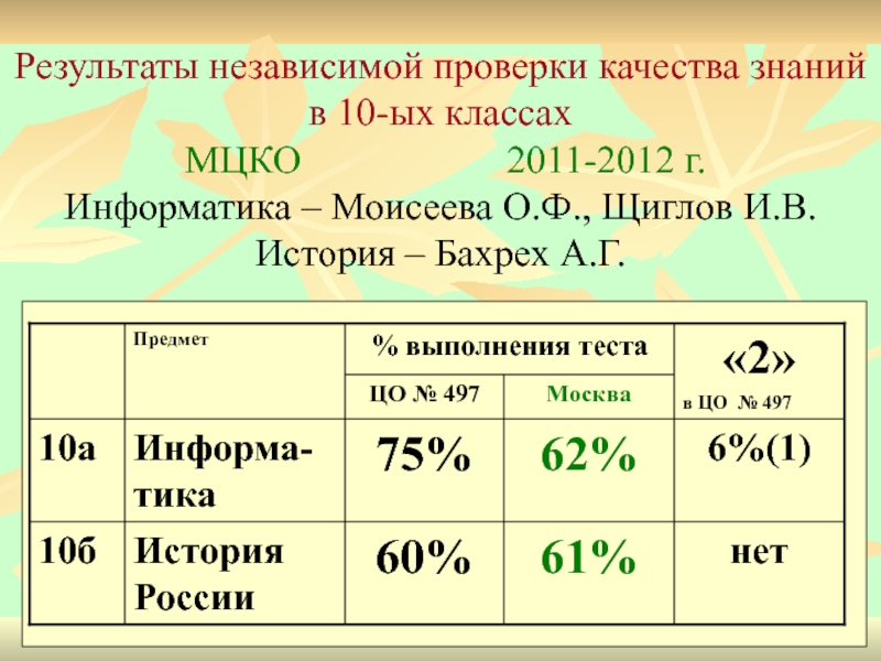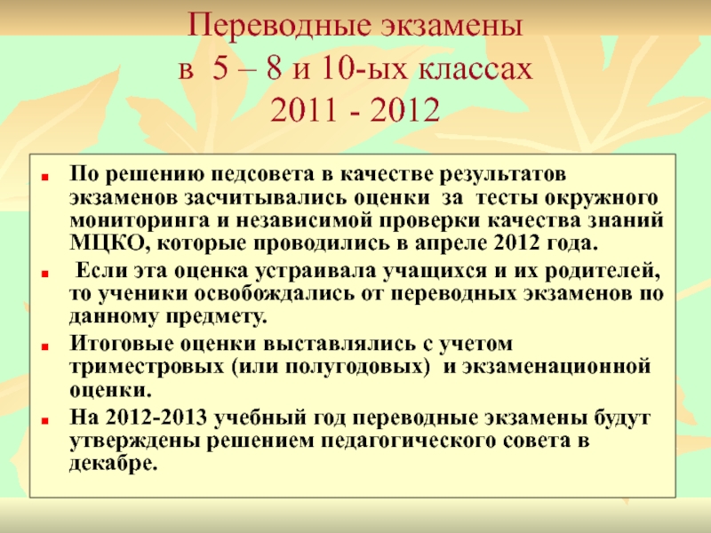 решению педсовета в качестве результатов экзаменов засчитывались оценки за тесты окружного мониторинга и независимой проверки качества знаний МЦКО, которые проводились в апреле 2012 года.