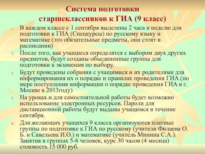 Для желающих учащихся 9 класса организуются платные группы по подготовке к ГИА по русскому (учителя Филаева О.Б. и Савельева И.О.) и математике (учитель Минина С.А.). Занятия в группах 5-6 человек, курс 30 часов (4 месяца) стоимость 15 000 руб.
