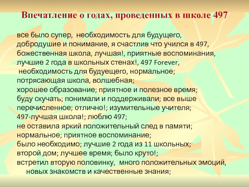 Слайд 45Впечатление о годах, проведенных в школе 497