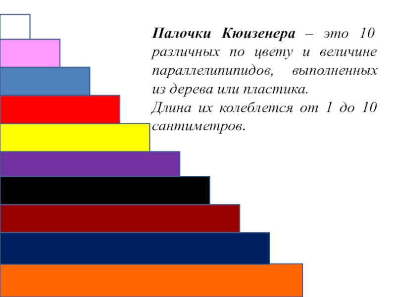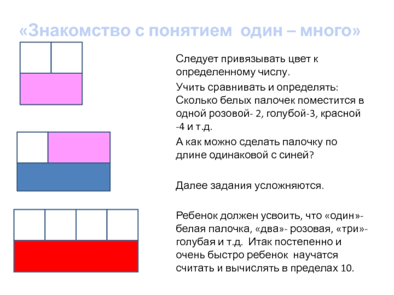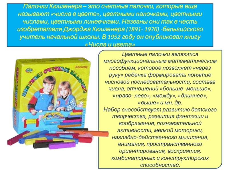 Цветные палочки являются многофункциональным математическим пособием, которое позволяет «через руку» ребенка формировать понятие числовой последовательности, состава числа, отношений «больше- меньше», «право- лево», «между», «длиннее», «выше» и мн. др.