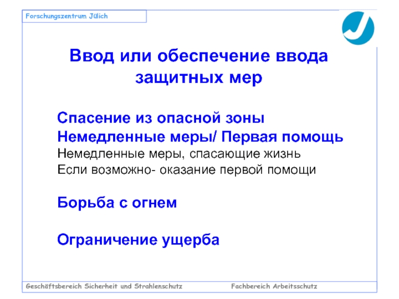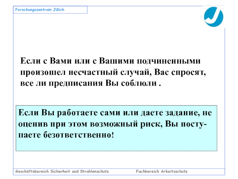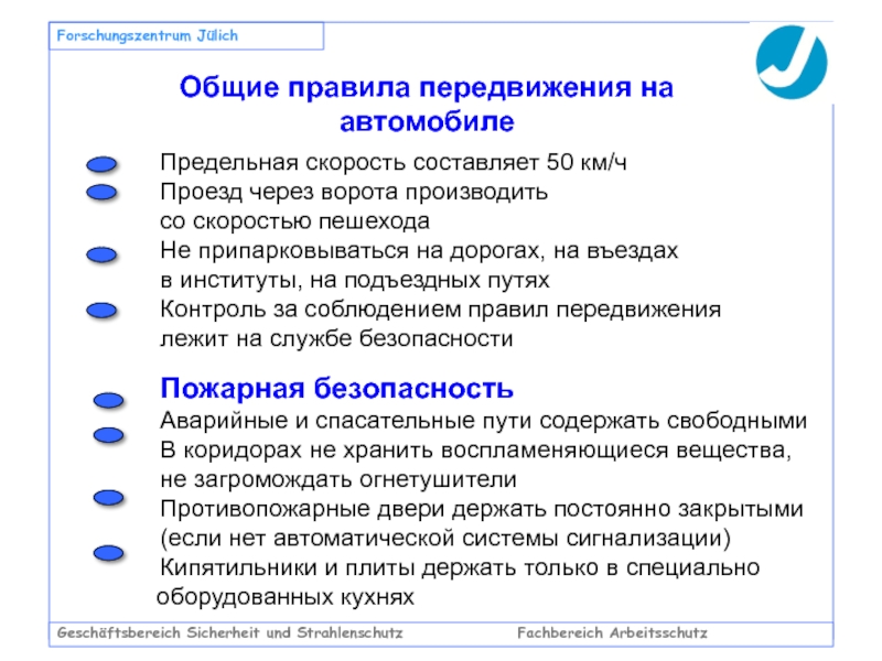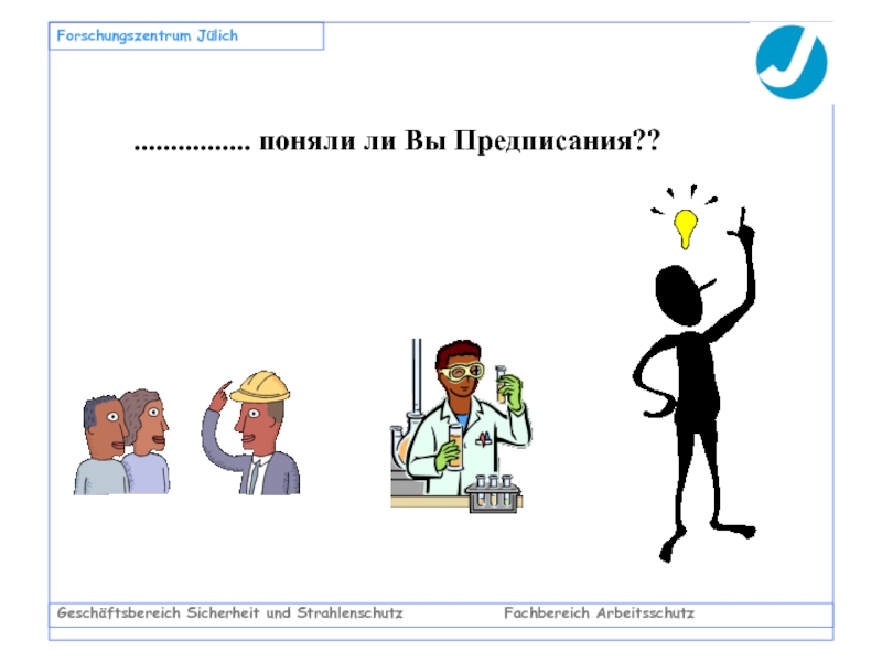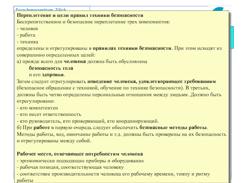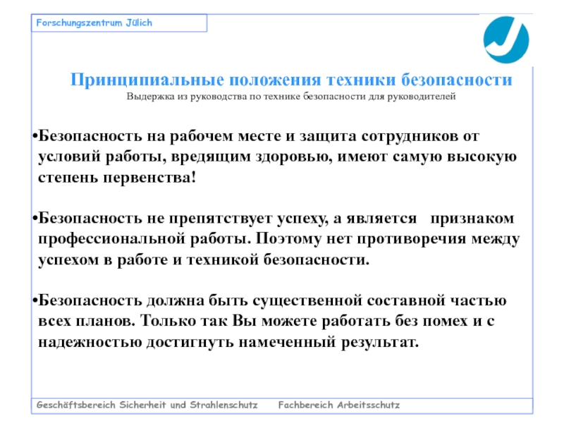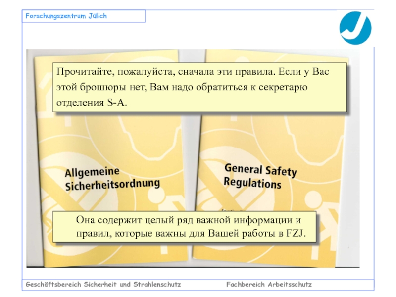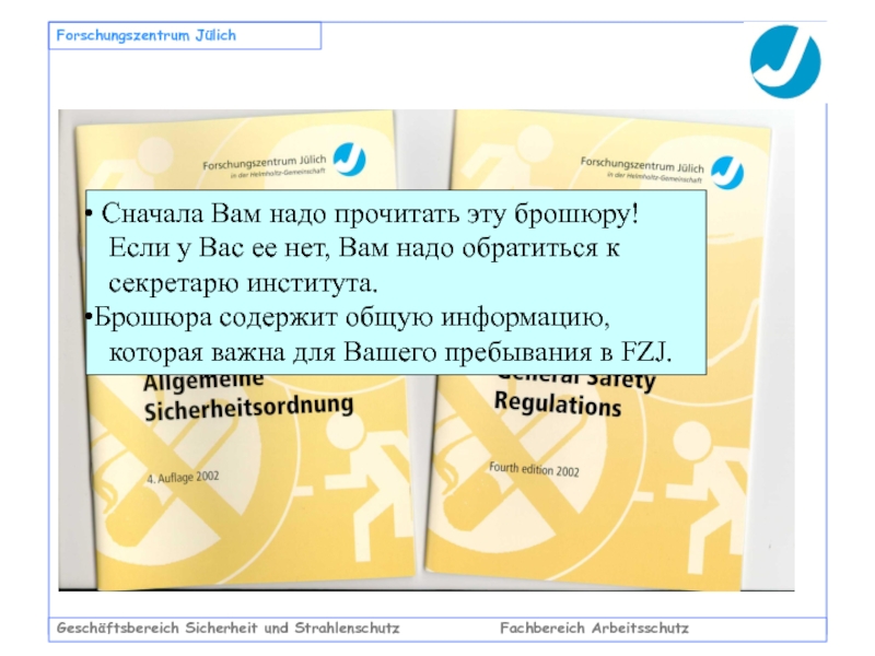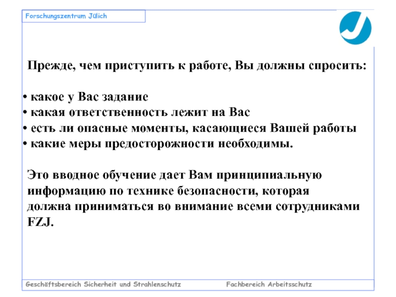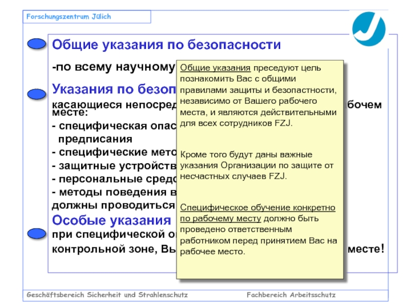 Общие указания преседуют цель познакомить Вас с общими правилами защиты и безопастности, независимо от Вашего рабочего места, и являются действительными для всех сотрудников FZJ.
