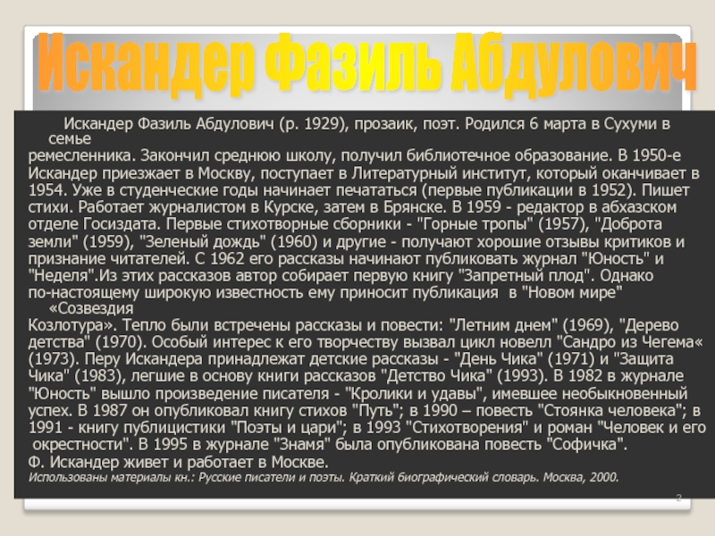 (1973). Перу Искандера принадлежат детские рассказы - "День Чика" (1971) и "Защита