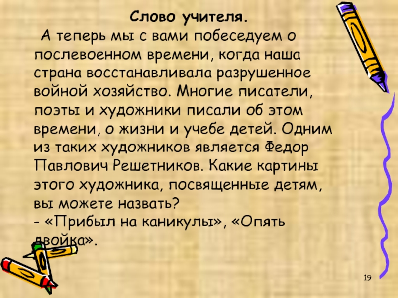 когда наша страна восстанавливала разрушенное войной хозяйство. Многие писатели, поэты и художники писали об этом времени, о жизни и учебе детей. Одним из таких художников является Федор Павлович Решетников. Какие картины этого художника, посвященные детям, вы можете назвать?