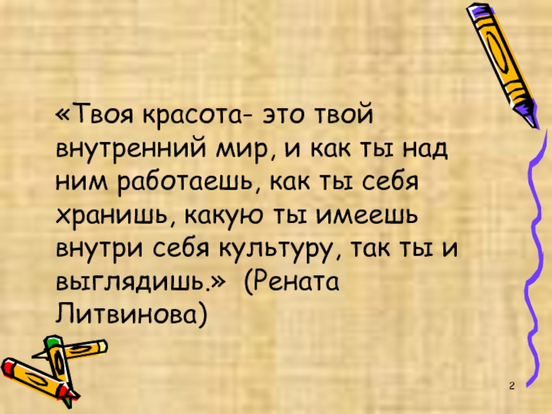 Слайд 2«Твоя красота- это твой внутренний мир, и как ты над ним