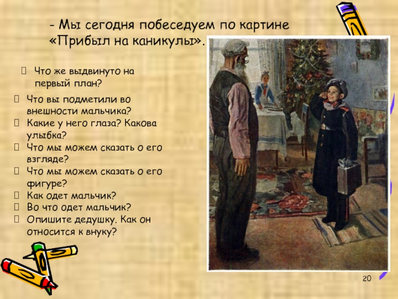 Слайд 20- Мы сегодня побеседуем по картине «Прибыл на каникулы».