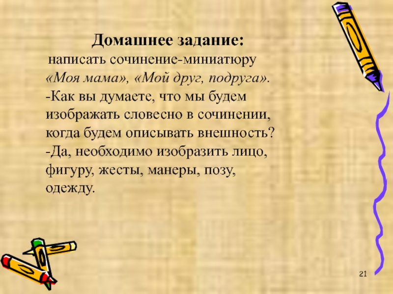 написать сочинение-миниатюру «Моя мама», «Мой друг, подруга».