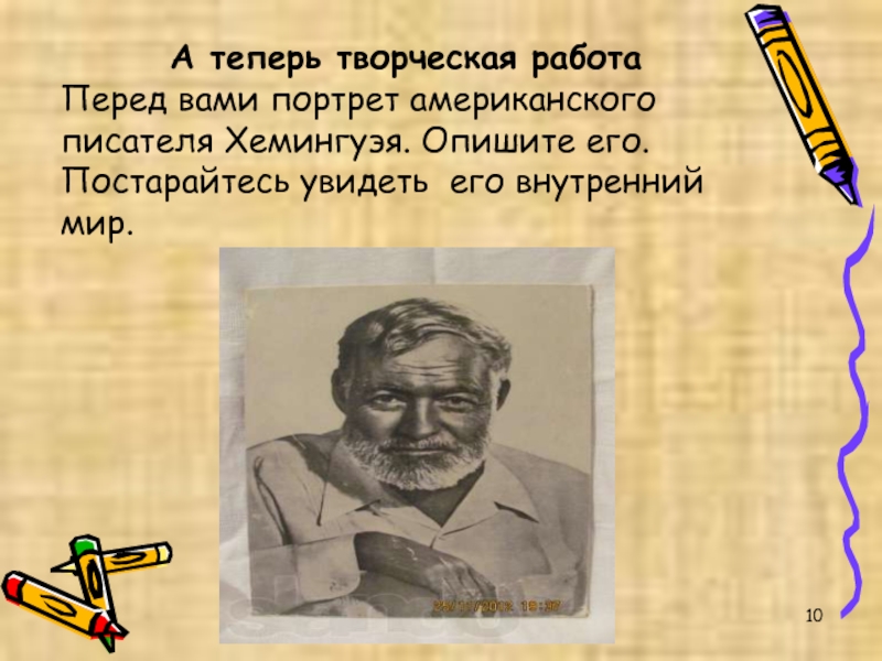 Перед вами портрет американского писателя Хемингуэя. Опишите