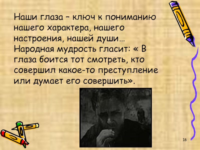 Слайд 18Наши глаза – ключ к пониманию нашего характера, нашего настроения, нашей