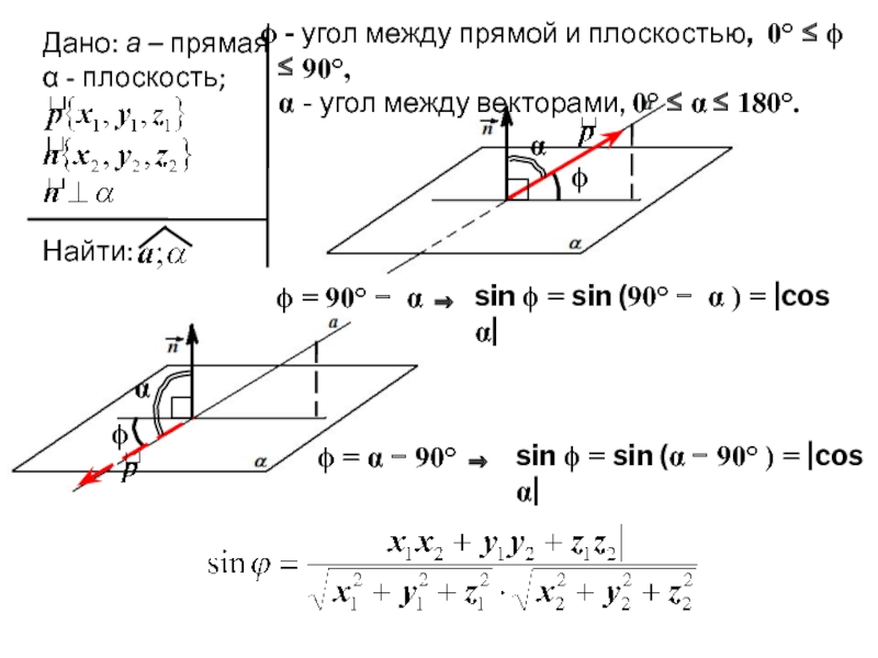 - угол между прямой и плоскостью, 0° ≤ ϕ ≤ 90°,