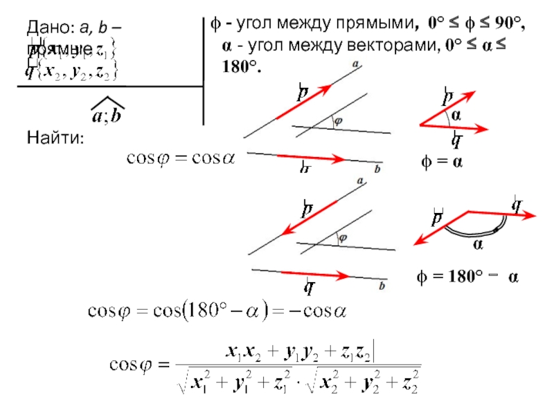 - угол между прямыми, 0° ≤ ϕ ≤ 90°,